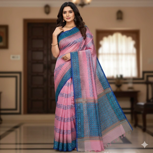 Meticulously crafted on traditional looms, each piece carries the unmistakable finesse of Jamdani weaving—floating motifs, airy texture, and delicate translucence—blended seamlessly with the rhythmic patterns of Ikkat artistry.