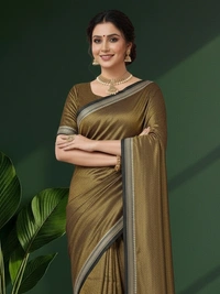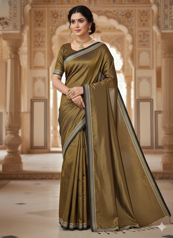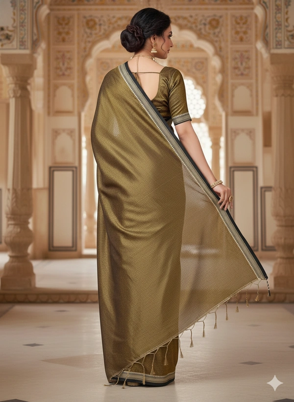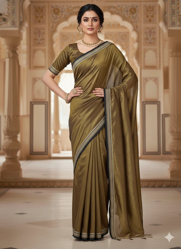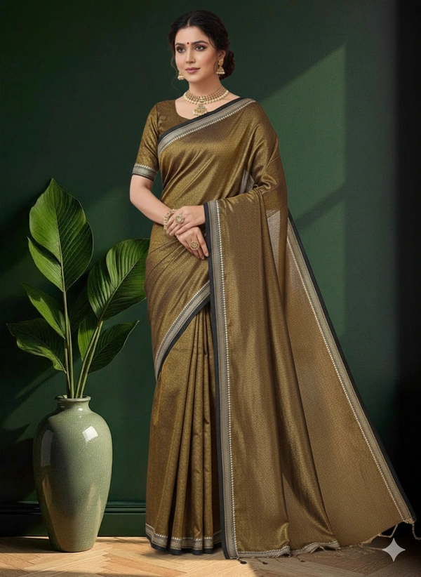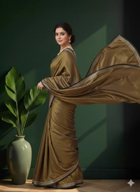 The fabric is lightweight, breathable, and gracefully lustrous, making it perfect for festive gatherings, celebrations, or elegant daywear. With its natural texture and golden glow, this saree beautifully combines comfort and sophistication.