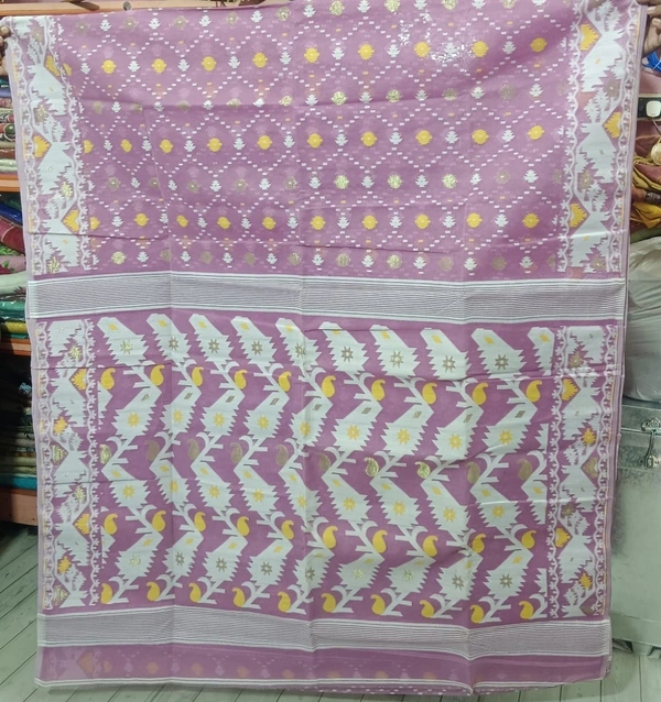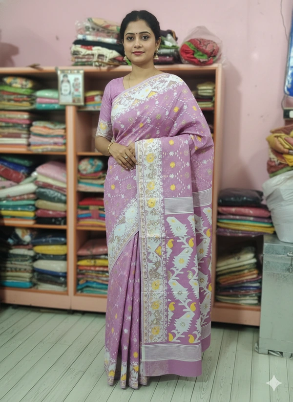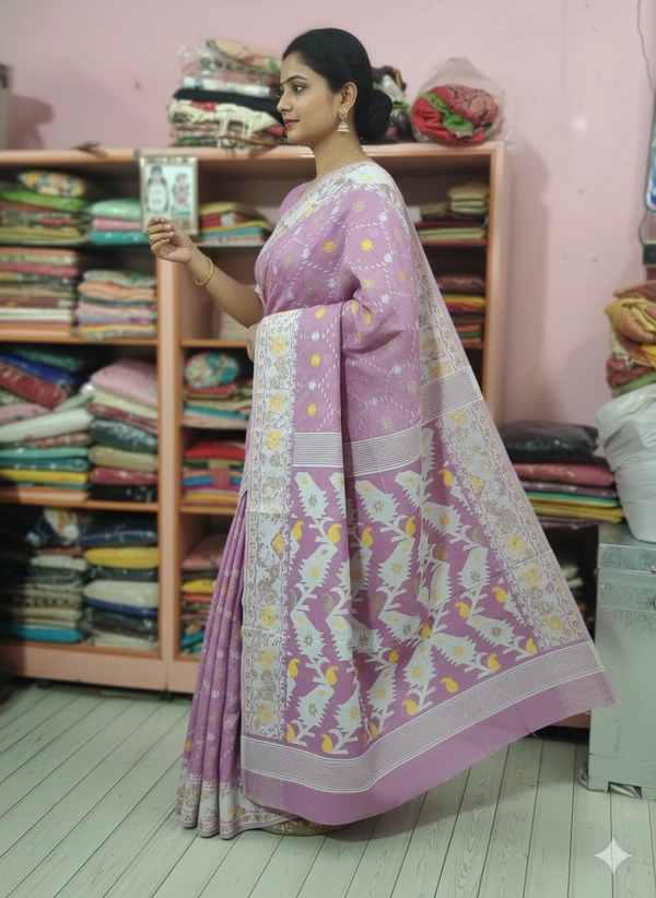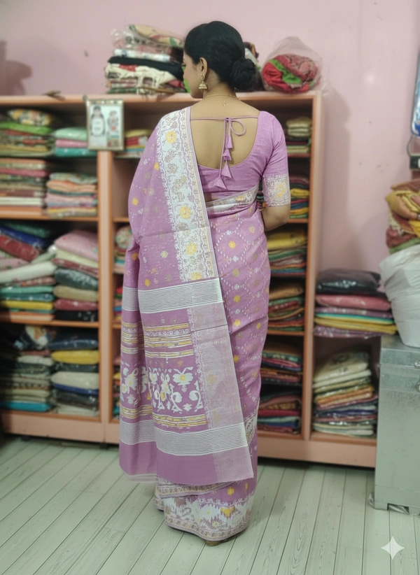 This Pure Jamdani Saree is a celebration of fine handloom artistry. Woven with precision and care, it showcases beautiful traditional motifs on a soft, lightweight fabric that feels as good as it looks. Elegant, breathable, and effortlessly graceful, this saree is perfect for those who love timeless style with a touch of heritage.