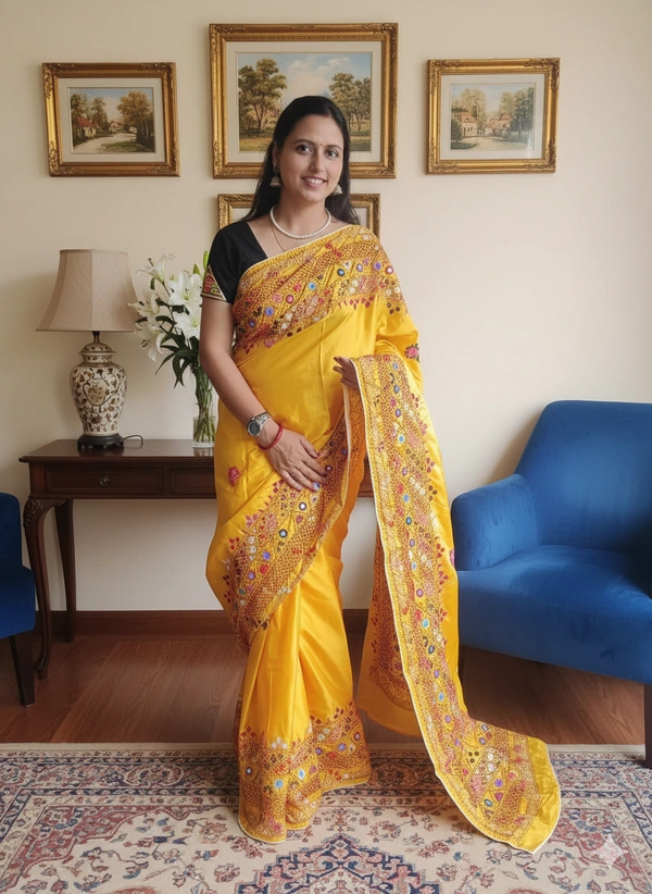 Each motif is delicately crafted using vibrant threads, mirrors, and zari highlights, creating a stunning contrast against the lustrous silk base. The saree’s soft texture ensures a graceful fall, while the handcrafted border and pallu reflect fine traditional detailing.