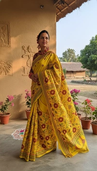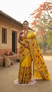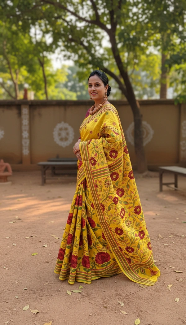 The rich silk fabric drapes effortlessly, making it perfect for long celebrations, weddings, festive occasions, and formal gatherings. Subtle detailing and refined borders add a touch of sophistication, while the vibrant yet graceful color palette enhances its regal charm.