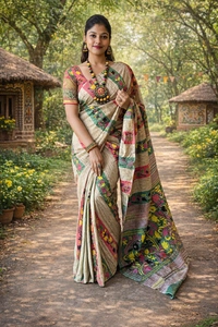 The lustrous katan silk lends richness and fluid drape, while the ghicha silk adds a natural, earthy texture, creating a beautifully balanced look. Ideal for festive occasions, cultural events, and elegant day functions, this saree reflects timeless craftsmanship with a contemporary edge.