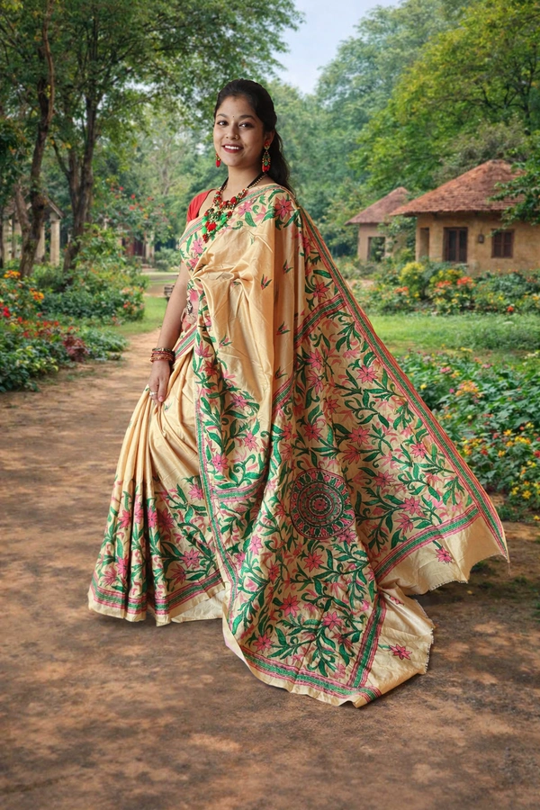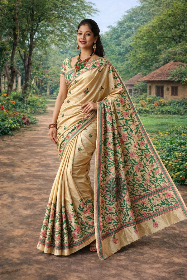 Perfect for cultural gatherings, festive occasions, and elegant day wear, the Gachi Tussar Kantha Stitch Saree blends earthy sophistication with artistic beauty.