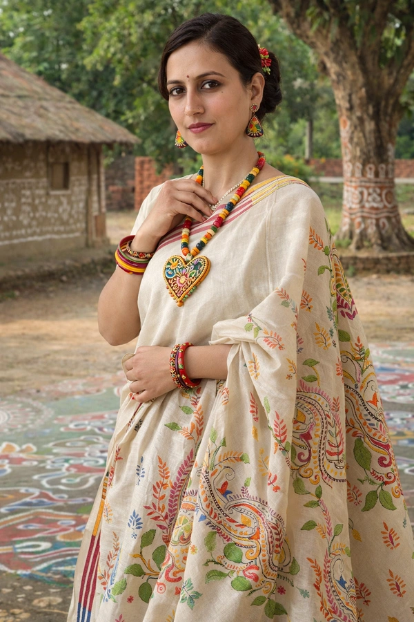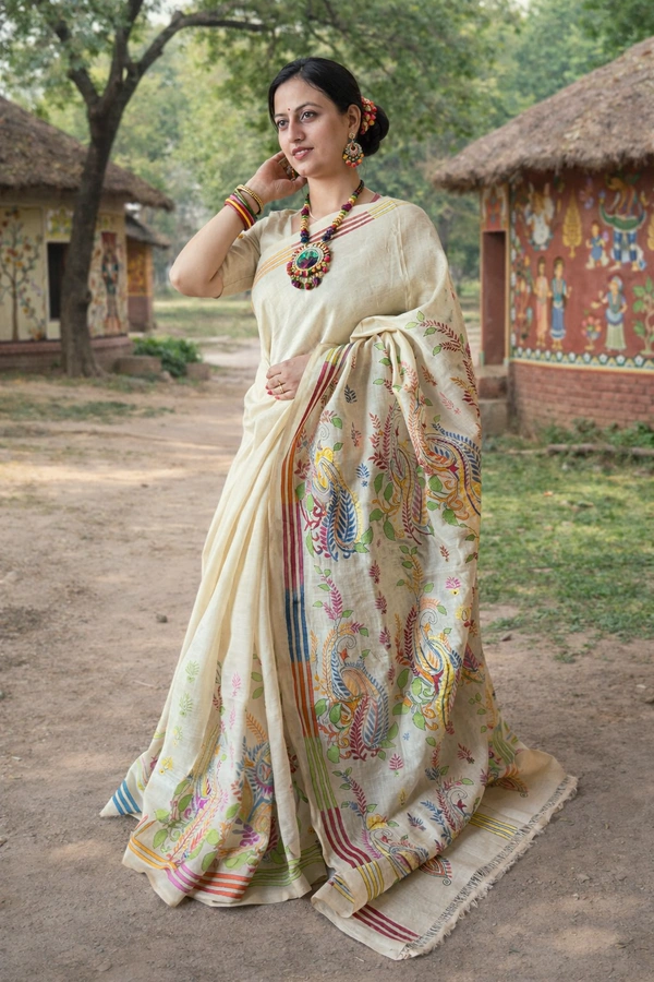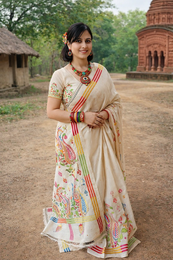 Perfect for cultural gatherings, festive occasions, and elegant day wear, the Gachi Tussar Kantha Stitch Saree blends earthy sophistication with artistic beauty.