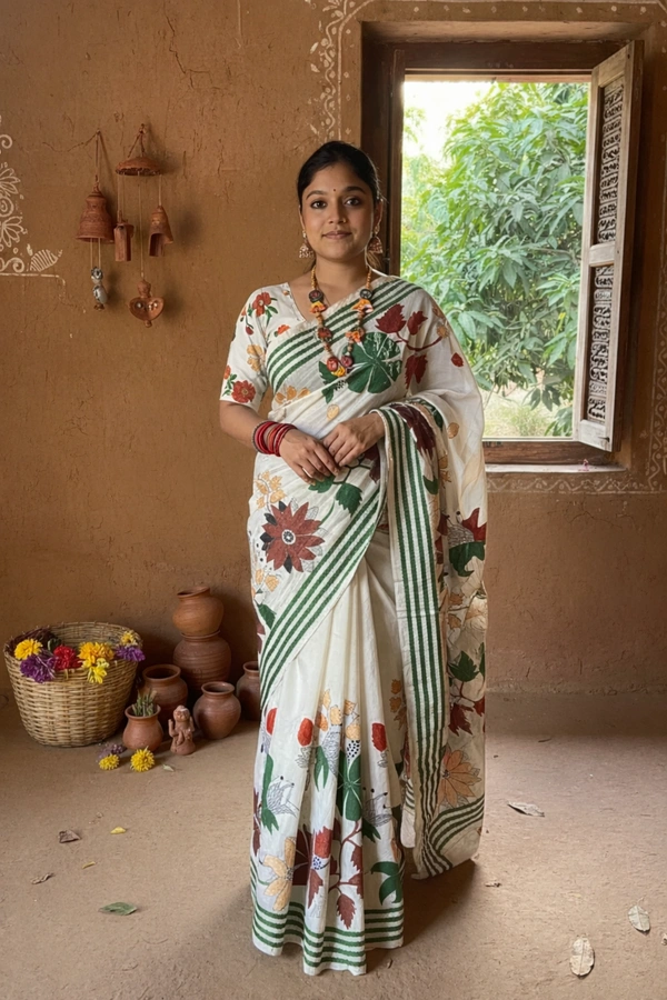 Perfect for cultural gatherings, festive occasions, and elegant day wear, the Gachi Tussar Kantha Stitch Saree blends earthy sophistication with artistic beauty.