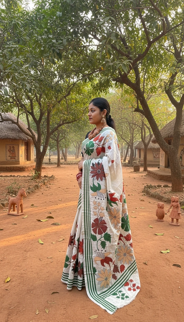The highlight of this saree is the intricate Kantha hand embroidery, carefully stitched by skilled artisans. The delicate running stitches create elegant motifs and patterns, adding depth, character, and a story to every drape. Each piece reflects hours of craftsmanship, making it truly one of a kind.