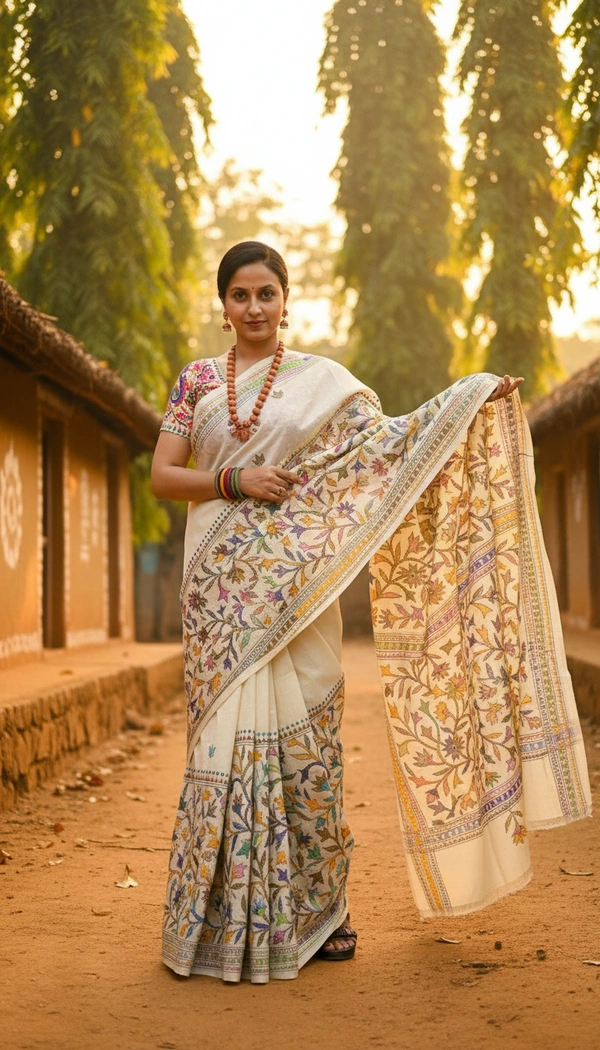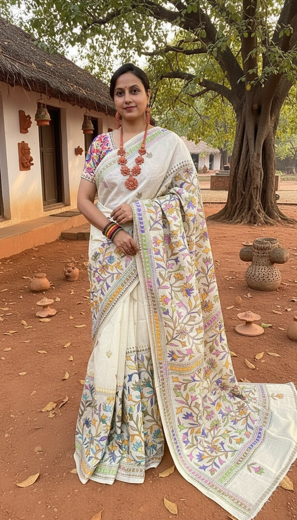 Perfect for cultural gatherings, festive occasions, and elegant day wear, the Gachi Tussar Kantha Stitch Saree blends earthy sophistication with artistic beauty.