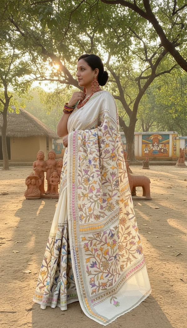The highlight of this saree is the intricate Kantha hand embroidery, carefully stitched by skilled artisans. The delicate running stitches create elegant motifs and patterns, adding depth, character, and a story to every drape. Each piece reflects hours of craftsmanship, making it truly one of a kind.