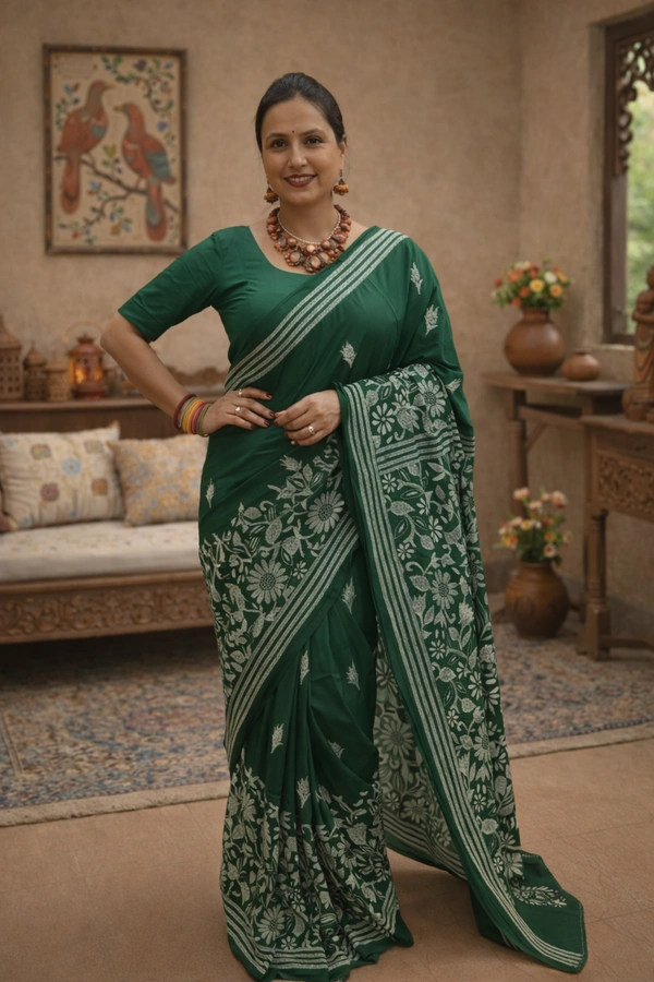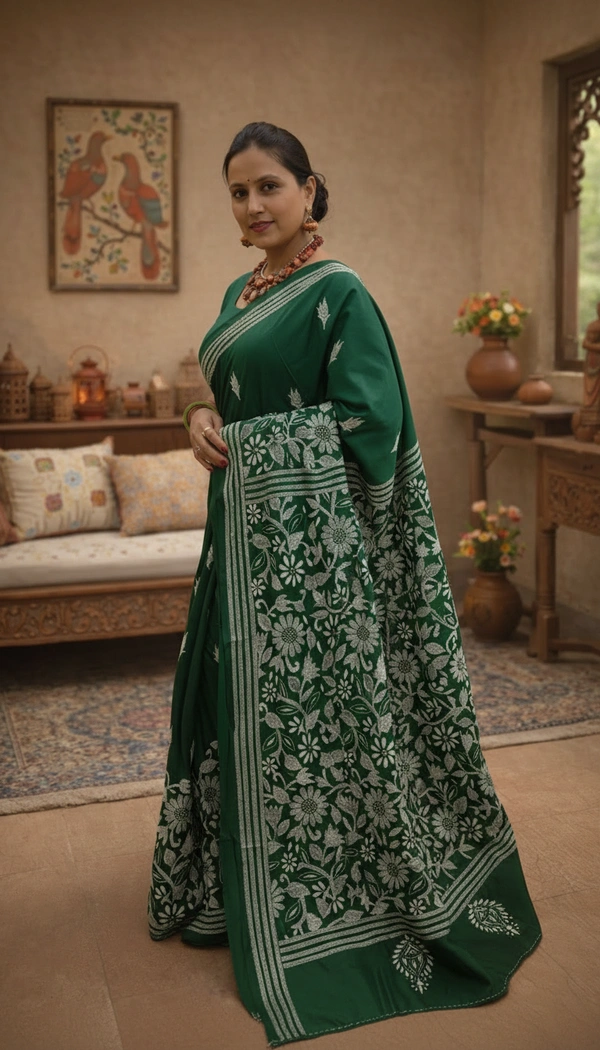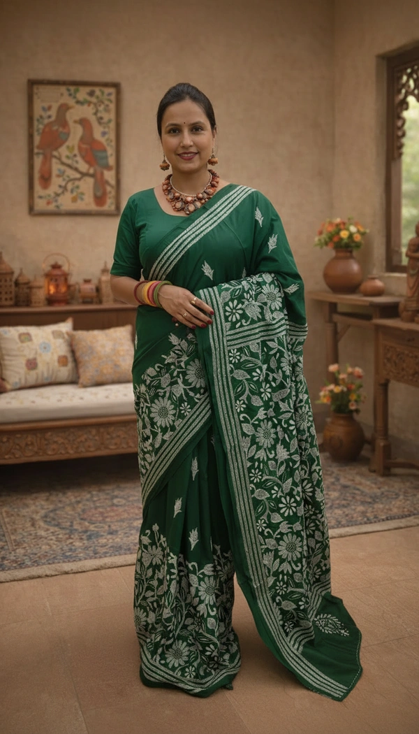 Blended Bangalore Silk With Handcrafted Kantha Embroidery.
