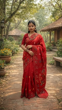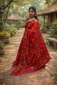 This exquisite fabric is woven from premium blended Bangalore silk, offering a smooth drape and refined sheen. Enhanced with handcrafted Kantha embroidery, the delicate running stitches create a rich texture and timeless elegance. Each piece reflects skilled artisanal craftsmanship, making it a statement of understated luxury.