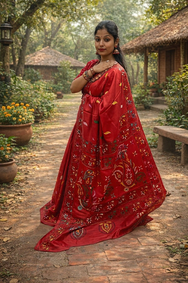 Blended Bangalore Silk With Handcrafted Kantha Embroidery.