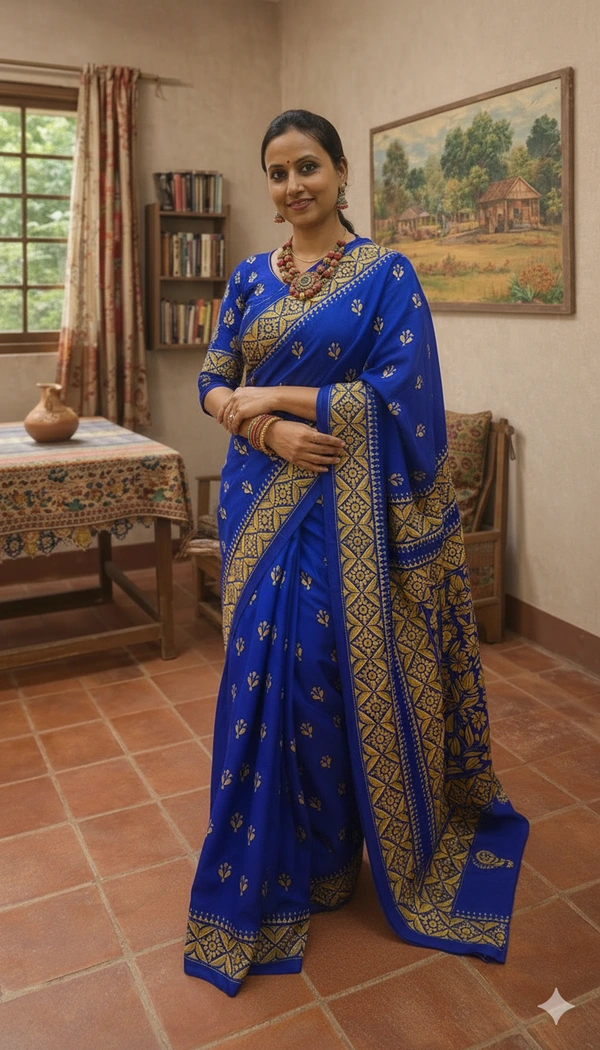 Blended Bangalore Silk With Handcrafted Kantha Embroidery.
