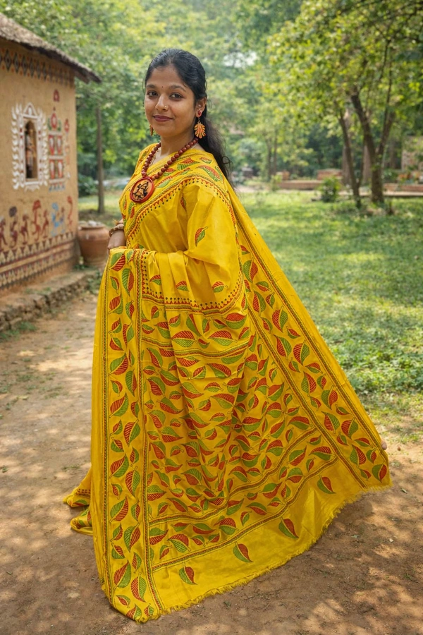 Blended Bangalore Silk With Handcrafted Kantha Embroidery.
