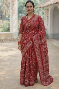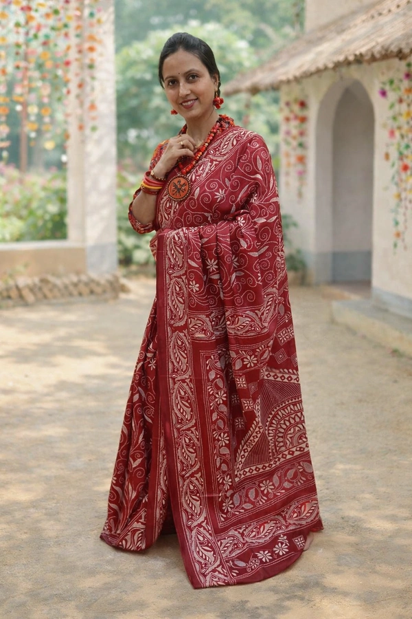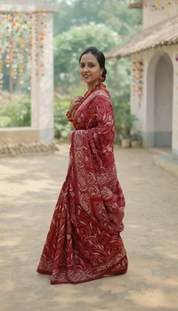 This exquisite fabric is woven from premium blended Bangalore silk, offering a smooth drape and refined sheen. Enhanced with handcrafted Kantha embroidery, the delicate running stitches create a rich texture and timeless elegance. Each piece reflects skilled artisanal craftsmanship, making it a statement of understated luxury.
