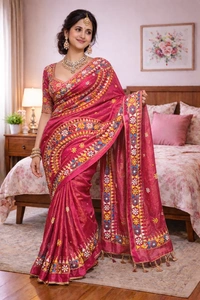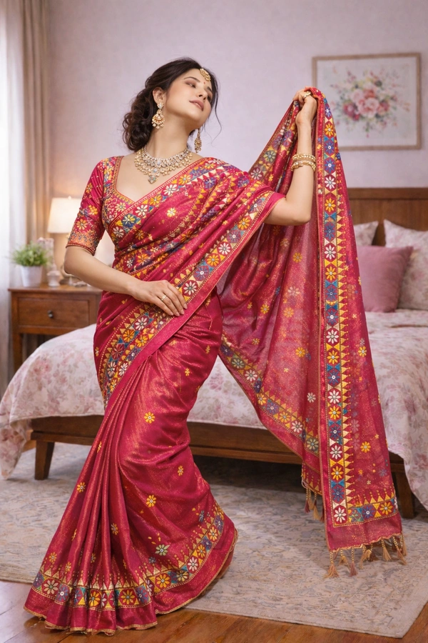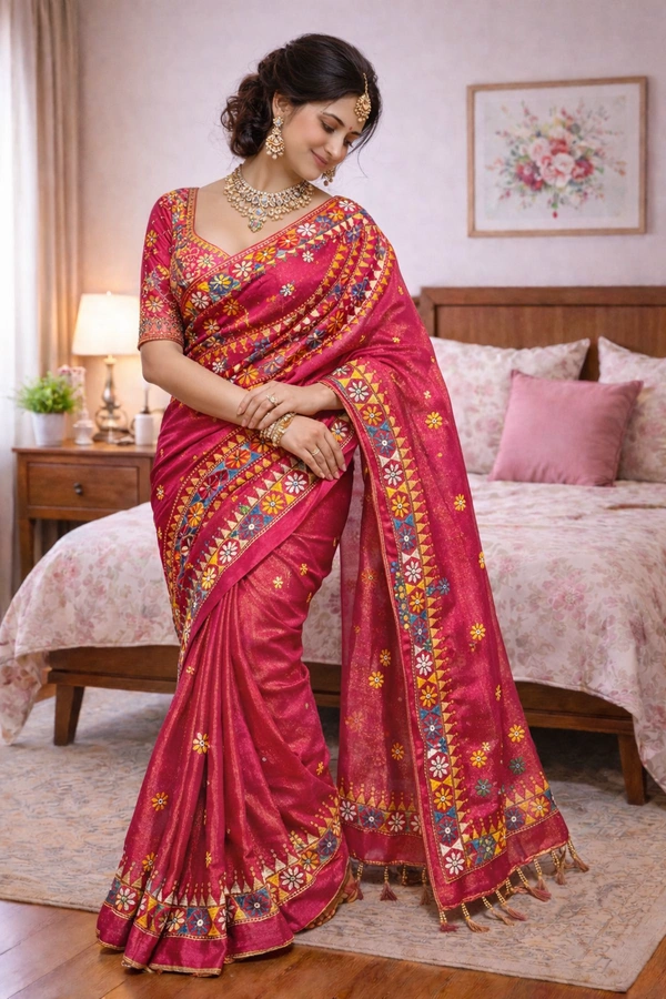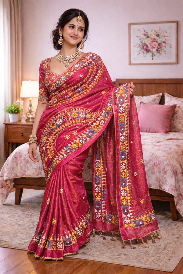 This exquisite tissue silk saree is a perfect blend of subtle sheen and vibrant tradition. The lightweight, glossy texture of tissue silk drapes gracefully, while the intricate Lambani embroidery adds a striking handcrafted touch. Rich in detail and cultural artistry, it’s an ideal choice for festive occasions and elegant celebrations.