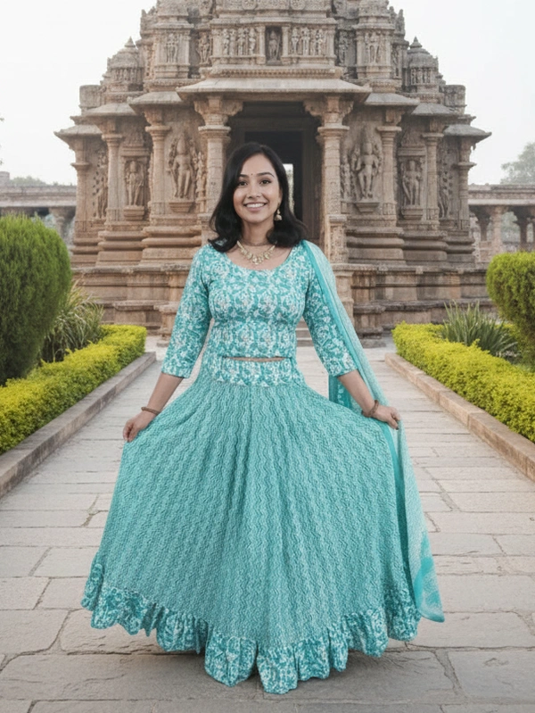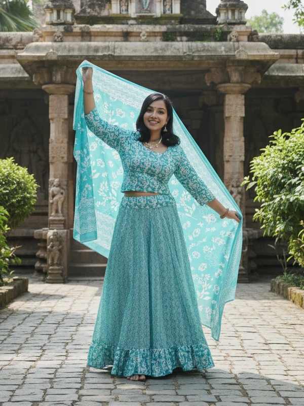 This set includes a perfectly stitched lehenga, a matching blouse, and a coordinating dupatta—ready to wear straight out of the box. The lightweight fabric ensures all-day comfort, while the flowy silhouette gives a graceful and flattering look.
